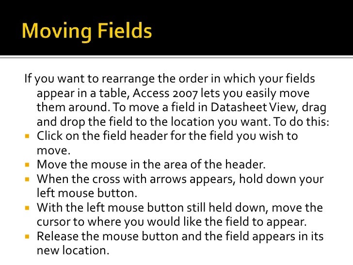 18. 18. Moving Fields<br />If you want to rearrange the order in which your fields appear in a table, Access 2007 lets you easily move them around. To move a field in Datasheet View, drag and drop the field to the location you want. To do this:<br />Click on the field header for the field you wish to move.<br />Move the mouse in the area of the header.<br />When the cross with arrows appears, hold down your left mouse button.<br />With the left mouse button still held down, move the cursor to where you would like the field to appear.<br />Release the mouse button and the field appears in its new location.<br />