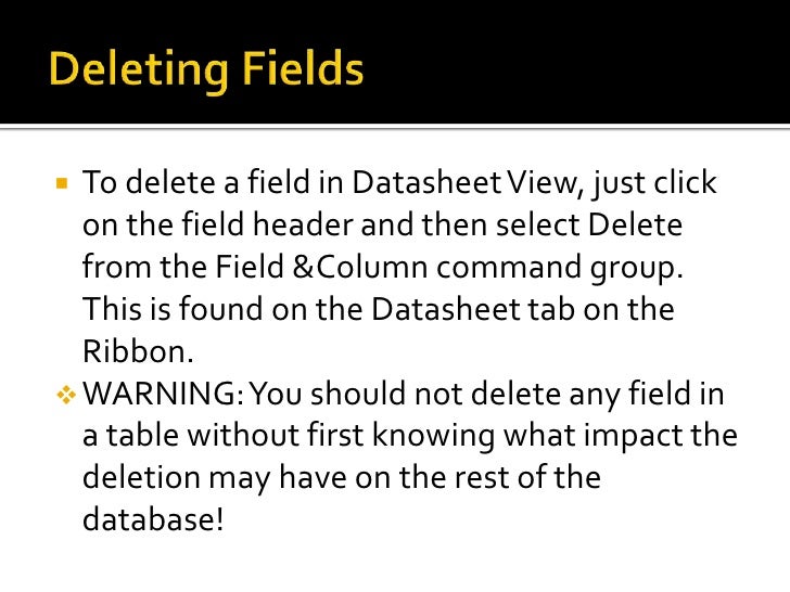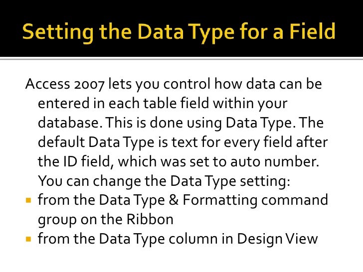 19. 19. Deleting Fields<br />To delete a field in Datasheet View, just click on the field header and then select Delete from the Field &Column command group. This is found on the Datasheet tab on the Ribbon.<br /><ul><li>WARNING: You should not delete any field in a table without first knowing what impact the deletion may have on the rest of the database!</li></li></ul><li>Setting the Data Type for a Field<br />Access 2007 lets you control how data can be entered in each table field within your database. This is done using Data Type. The default Data Type is text for every field after the ID field, which was set to auto number. You can change the Data Type setting:<br />from the Data Type & Formatting command group on the Ribbon<br />from the Data Type column in Design View<br />