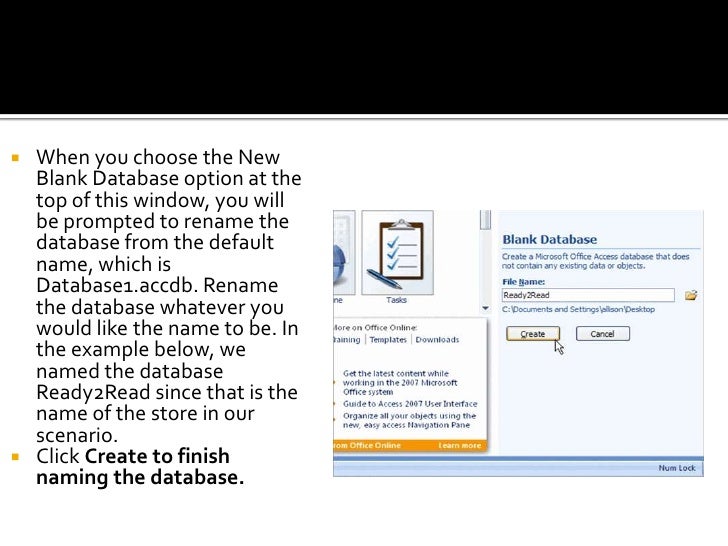 4. 4. When you choose the New Blank Database option at the top of this window, you will be prompted to rename the database from the default name, which is Database1.accdb. Rename the database whatever you would like the name to be. In the example below, we named the database Ready2Read since that is the name of the store in our scenario.<br />Click Create to finish naming the database.<br />