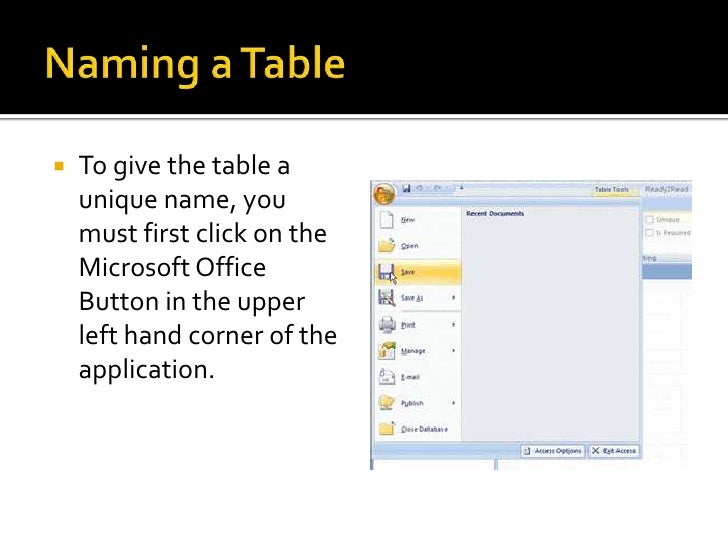 6. 6. Naming a Table<br />To give the table a unique name, you must first click on the Microsoft Office Button in the upper left hand corner of the application.<br />