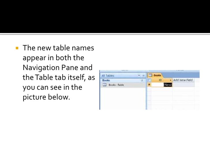 5. 5. Setting up Tables<br />The new database opens with one table showing as a default. It also defaults to naming this table Table1 in both the Navigation Pane, and the Table tab itself. You will want to name your tables based on your database design plan.<br />