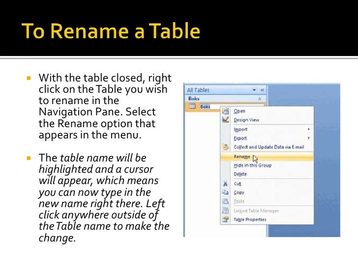9. 9. To Rename a Table<br />With the table closed, right click on the Table you wish to rename in the Navigation Pane. Select the Rename option that appears in the menu. <br />The table name will be highlighted and a cursor will appear, which means you can now type in the new name right there. Left click anywhere outside of the Table name to make the change.<br />