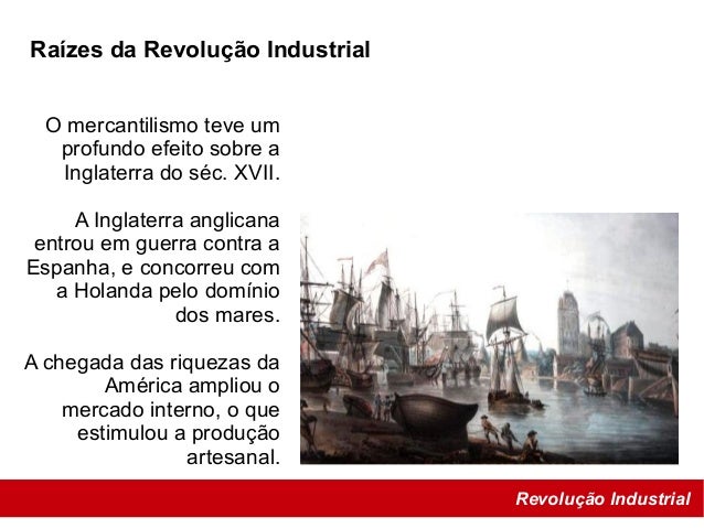 13. 13. Revolução Industrial Raízes da Revolução Industrial O mercantilismo teve um profundo efeito sobre a Inglaterra do séc. XVII. A Inglaterra anglicana entrou em guerra contra a Espanha, e concorreu com a Holanda pelo domínio dos mares. A chegada das riquezas da América ampliou o mercado interno, o que estimulou a produção artesanal.