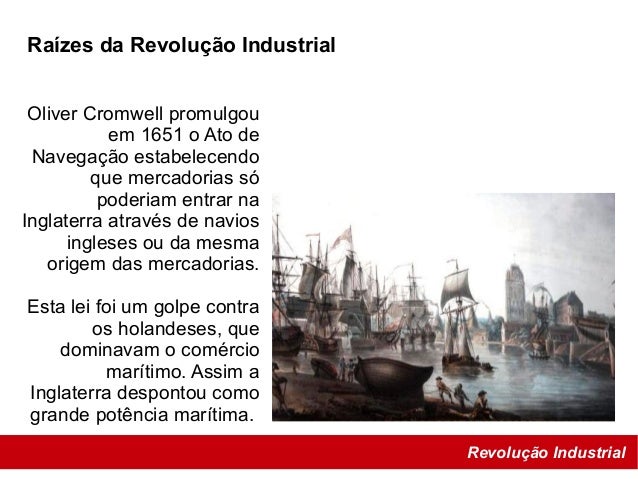 14. 14. Revolução Industrial Raízes da Revolução Industrial Oliver Cromwell promulgou em 1651 o Ato de Navegação estabelecendo que mercadorias só poderiam entrar na Inglaterra através de navios ingleses ou da mesma origem das mercadorias. Esta lei foi um golpe contra os holandeses, que dominavam o comércio marítimo. Assim a Inglaterra despontou como grande potência marítima.