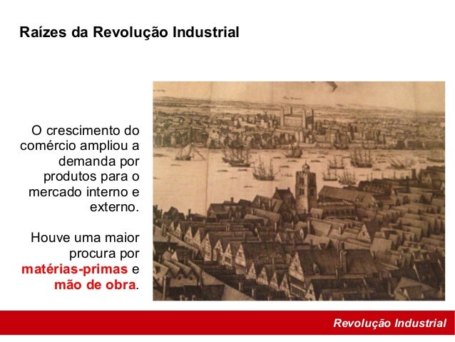 15. 15. Revolução Industrial Raízes da Revolução Industrial O crescimento do comércio ampliou a demanda por produtos para o mercado interno e externo. Houve uma maior procura por matérias-primas e mão de obra.