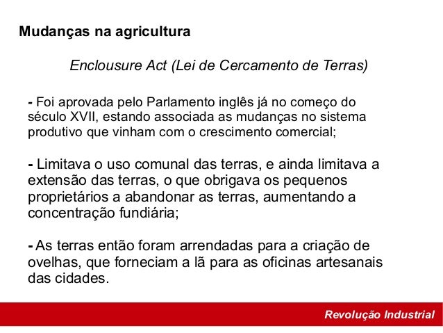 17. 17. Revolução Industrial Enclousure Act (Lei de Cercamento de Terras) Mudanças na agricultura - Foi aprovada pelo Parlamento inglês já no começo do século XVII, estando associada as mudanças no sistema produtivo que vinham com o crescimento comercial; - Limitava o uso comunal das terras, e ainda limitava a extensão das terras, o que obrigava os pequenos proprietários a abandonar as terras, aumentando a concentração fundiária; - As terras então foram arrendadas para a criação de ovelhas, que forneciam a lã para as oficinas artesanais das cidades.