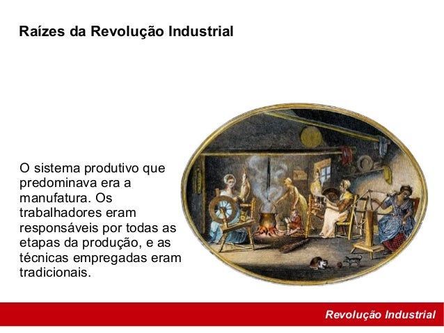 19. 19. Revolução Industrial Raízes da Revolução Industrial O sistema produtivo que predominava era a manufatura. Os trabalhadores eram responsáveis por todas as etapas da produção, e as técnicas empregadas eram tradicionais.