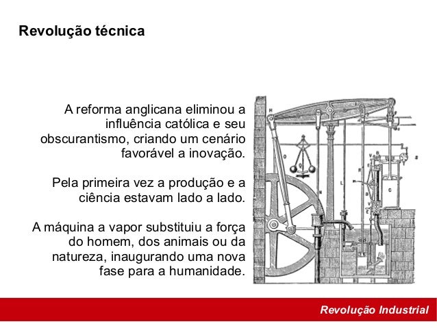 23. 23. Revolução Industrial Revolução técnica A reforma anglicana eliminou a influência católica e seu obscurantismo, criando um cenário favorável a inovação. Pela primeira vez a produção e a ciência estavam lado a lado. A máquina a vapor substituiu a força do homem, dos animais ou da natureza, inaugurando uma nova fase para a humanidade.