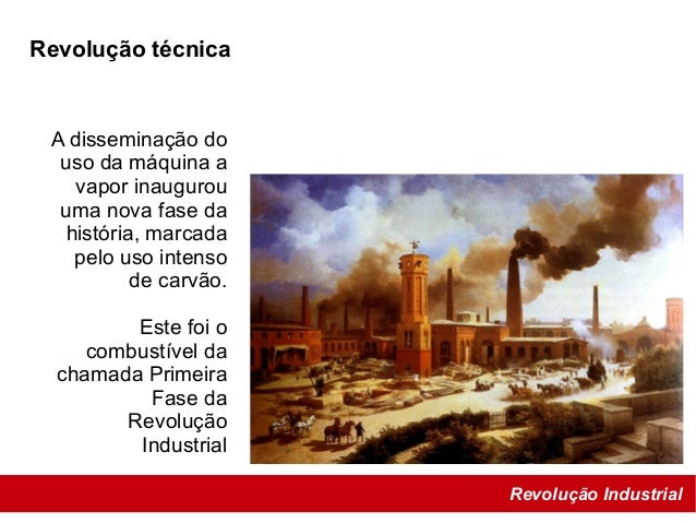 27. 27. Revolução Industrial Revolução técnica A disseminação do uso da máquina a vapor inaugurou uma nova fase da história, marcada pelo uso intenso de carvão. Este foi o combustível da chamada Primeira Fase da Revolução Industrial