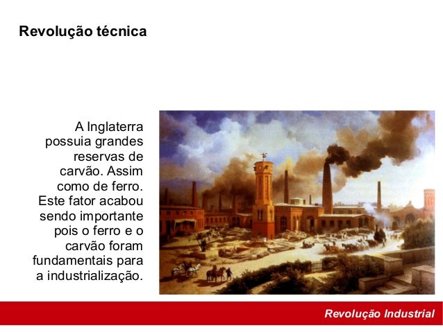 28. 28. Revolução Industrial Revolução técnica A Inglaterra possuia grandes reservas de carvão. Assim como de ferro. Este fator acabou sendo importante pois o ferro e o carvão foram fundamentais para a industrialização.