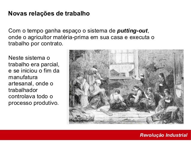 33. 33. Revolução Industrial Novas relações de trabalho Neste sistema o trabalho era parcial, e se iniciou o fim da manufatura artesanal, onde o trabalhador controlava todo o processo produtivo. Com o tempo ganha espaço o sistema de putting-out, onde o agricultor matéria-prima em sua casa e executa o trabalho por contrato.
