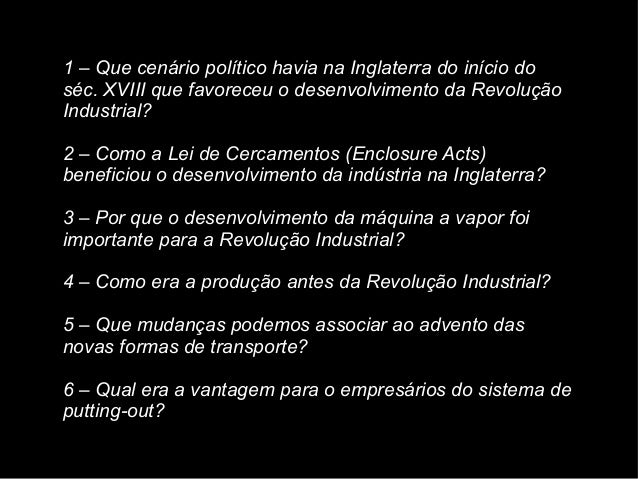35. 35. 1 – Que cenário político havia na Inglaterra do início do séc. XVIII que favoreceu o desenvolvimento da Revolução Industrial? 2 – Como a Lei de Cercamentos (Enclosure Acts) beneficiou o desenvolvimento da indústria na Inglaterra? 3 – Por que o desenvolvimento da máquina a vapor foi importante para a Revolução Industrial? 4 – Como era a produção antes da Revolução Industrial? 5 – Que mudanças podemos associar ao advento das novas formas de transporte? 6 – Qual era a vantagem para o empresários do sistema de putting-out?
