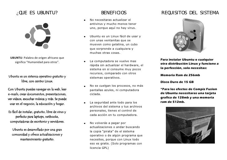 Triptico que habla de lo que es linux y requerimientos del sistema para Ubuntu