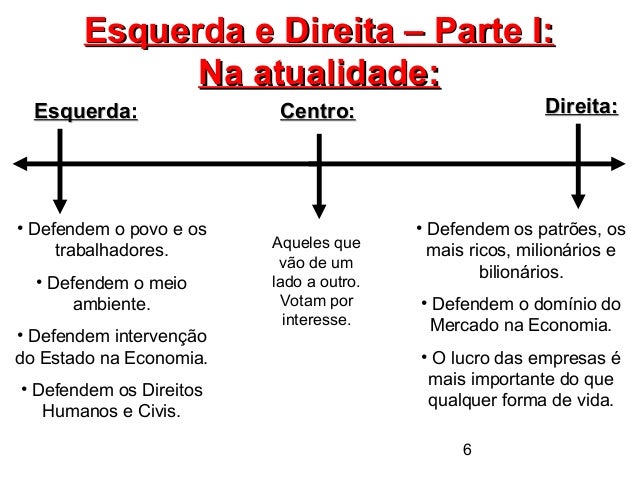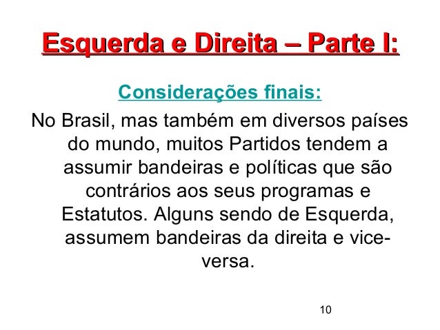 10. 10. 10 Esquerda e Direita – Parte I:Esquerda e Direita – Parte I: Considerações finais: No Brasil, mas também em diversos países do mundo, muitos Partidos tendem a assumir bandeiras e políticas que são contrários aos seus programas e Estatutos. Alguns sendo de Esquerda, assumem bandeiras da direita e vice- versa.