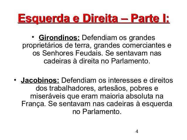 2. 2. 2 Esquerda e Direita – Parte I:Esquerda e Direita – Parte I: Os conceitos de esquerda e direita nascem durante a Revolução Francesa: depois da tomada da bastilha em 14 de julho de 1789, dois grandes grupos dividem o Parlamento Francês: Os Girondinos e os Jacobinos.