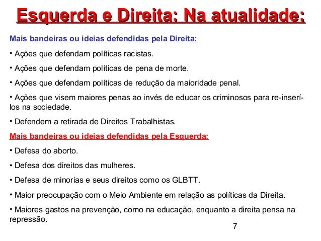 7. 7. 7 Esquerda e Direita: Na atualidade:Esquerda e Direita: Na atualidade: Mais bandeiras ou ideias defendidas pela Direita: • Ações que defendam políticas racistas. • Ações que defendam políticas de pena de morte. • Ações que defendam políticas de redução da maioridade penal. • Ações que visem maiores penas ao invés de educar os criminosos para re-inserí- los na sociedade. • Defendem a retirada de Direitos Trabalhistas. Mais bandeiras ou ideias defendidas pela Esquerda: • Defesa do aborto. • Defesa dos direitos das mulheres. • Defesa de minorias e seus direitos como os GLBTT. • Maior preocupação com o Meio Ambiente em relação as políticas da Direita. • Maiores gastos na prevenção, como na educação, enquanto a direita pensa na repressão.