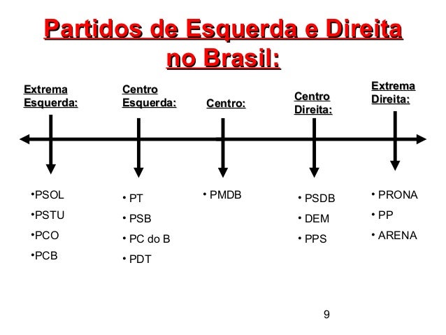 8. 8. 8 Esquerda e Direita – Parte I:Esquerda e Direita – Parte I: Brasil:Brasil: • Existem Partidos Políticos e movimentos sociais de centro esquerda, extrema esquerda, centro, centro direita e extrema direita no Brasil e em todos os países do mundo. • Estas divisões se refletem em todas as Instituições da sociedade em todas as nações do mundo: das mais desenvolvidas as menos desenvolvidas.