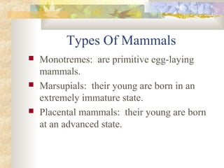 3. 3. Types Of Mammals  Monotremes: are primitive egg-laying mammals.  Marsupials: their young are born in an extremely immature state.  Placental mammals: their young are born at an advanced state.