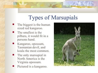 6. 6. Marsupials  Marsupials are pouched mammals whose babies are born in a very undeveloped state. The young attach themselves to their mother. Many marsupials have a pouch that encloses the young.  Marsupials evolved about 100 to 75 million years ago, during the time of the dinosaurs.
