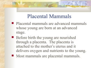 8. 8. Placental Mammals  Placental mammals are advanced mammals whose young are born at an advanced stage.  Before birth the young are nourished through a placenta. The placenta is attached to the mother’s uterus and it delivers oxygen and nutrients to the young.  Most mammals are placental mammals.