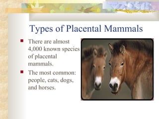 9. 9. Types of Placental Mammals  There are almost 4,000 known species of placental mammals.  The most common: people, cats, dogs, and horses.