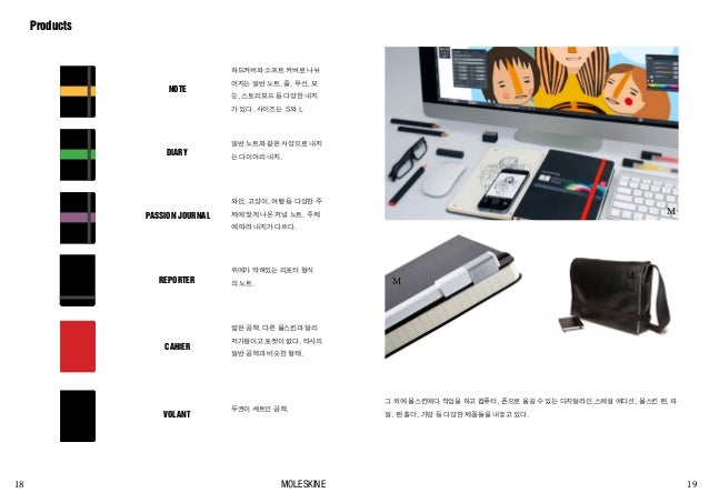 10. 10. 18 19MOLESKINE Products NOTE DIARY PASSION JOURNAL REPORTER CAHIER VOLANT 하드커버와 소프트 커버로 나뉘 어지는 일반 노트. 줄, 무선, 모 눈, 스토리보드 등 다양한 내지 가 있다. 사이즈는 S와 L 일반 노트와 같은 사양으로 내지 는 다이어리 내지. 두권이 세트인 공책. 얇은 공책. 다른 몰스킨과 달리 저가형이고 포켓이 없다. 타사의 일반 공책과 비슷한 형태. 위에가 막혀있는 리포터 형식 의 노트. 와인, 고양이, 여행 등 다양한 주 제에 맞게 나온 저널 노트. 주제 에 따라 내지가 다르다. 그 외에 몰스킨에다 작업을 하고 컴퓨터, 폰으로 옮길 수 있는 디지털라인,스페셜 에디션, 몰스킨 펜, 파 일, 펜 홀더, 가방 등 다양한 제품들을 내놓고 있다. M M M