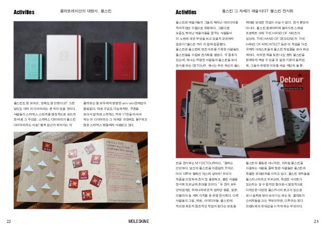 12. 12. 22 23MOLESKINE 몰스킨도 잘 모르고, 영화도 잘 안본다고? 그런 당신도 아마 이 다이어리는 본 적이 있을 것이다. 사람들이 스타벅스 스티커를 열정적으로 모으게 한 바로 그 주인공, 스타벅스 다이어리가 몰스킨 다이어리라는 사실! 벌써 삼년이 되어가는 이 콜라보는 둘 모두에게 분명한 win-win전략임이 틀림없다. 따로 구입도 가능하지만, 쿠폰을 모아서 받자면 스타벅스 커피 17잔을 마셔야 하는 이 다이어리는 그 어려운 과정에도 불구하고 많은 스타벅스 팬들에게 사랑받고 있다. Activities 콜라보레이션의 대명사, 몰스킨 Activities 몰스킨 그 자체가 예술이다? 몰스킨 전시회 몰스킨은 예술가들이 그들의 뛰어난 아이디어를 적어두었던 수첩으로 유명하다. 그렇다면 요즘도 뛰어난 예술가들을 꿈꾸는 사람들이 이 노트에 과연 무엇을 쓰고 있을지 궁금하지 않은가?몰스킨 역시 이 점에 집중했다. 몰스킨은 몰스킨에 멋진 아트를 기록한 사람들의 몰스킨들을 수집해 전시회를 열었다. 두 종휴가 있는데, 하나는 저명한 사람들의 몰스킨을 모아 전시를 여는 DETOUR, 하나는 우리 자신의 몰스 킨을 전시하는 MY DETOUR이다. “참여는 간단하다. 당신의 몰스킨을 아름답게 꾸미고, 마이 디투어 컬렉션 박스에 넣어라! 우리가 작품을 선정하여 전시 및 출판하고, 뽑힌 사람을 전시회 오프닝에 초대할 것이다.” 두 전시 모두 안타깝게도 우리나라에 온적 없지만 홍콩, 일본, 이탈리아 등 세계 각지를 돈 유명 전시회다. 다른 사람들의 그림, 메로, 아이디어들, 몰스킨에 적으면 뭐든지 창조적인 작업이 된다는 모토를 제대로 반영한 작업이 아닐 수 없다. 전시 뿐만이 아니다. 몰스킨 홈페이지에 들어가면 스페셜 프로젝트 아래 THE HAND OF 시리즈가 있는데, THE HAND OF DESIGNER, THE HAND OF ARCHITECT 등은 이 직업을 가진 국제적 아티스트들의 몰스킨 작업물을 모아 펴낸 책이다. 이러한 책을 보면 나도 왠지 몰스킨을 완벽하게 써낼 수 있을 것 같은 기분이 들지만, 뭐, 그들이 유명한 이유를 새삼 깨닫게 될 뿐. 몰스킨의 활동은 아니지만, 이처럼 몰스킨을 사용하는 사람들 중에 많은 사람들은 몰스킨과 특별한 유대관계를 가지고 있다. 몰스킨 유저들을 몰스키너리라고 부르는데, 특정한 사이트가 있는지는 알 수 없지만 찾아보니 열정적으로 디자인한 다양한 몰스키너리 로고가 있는걸 보니 실제로 많이 쓰이기는 하는 듯. 콜라보가 소비자들을 끄는 무엇이라면, 디투어는 보다 브랜드와의 유대감을 느끼게 하는 무엇이다.