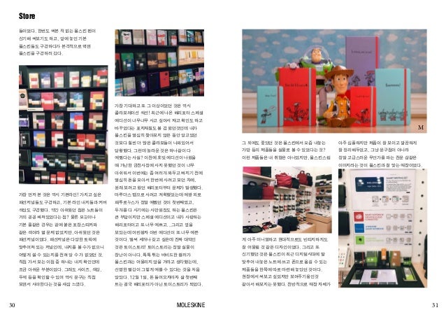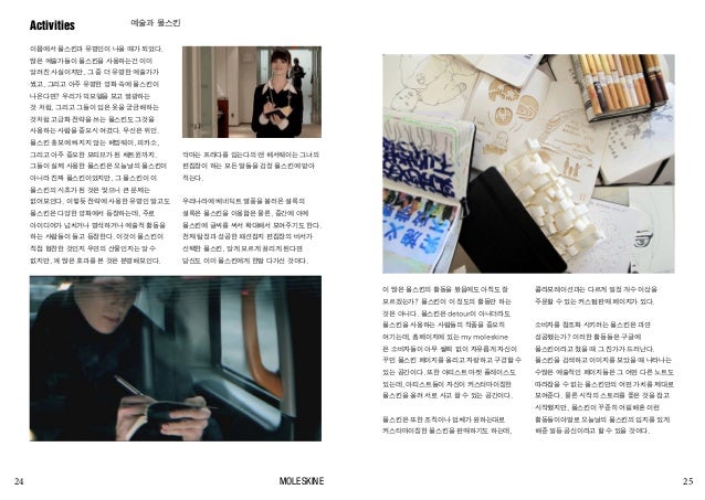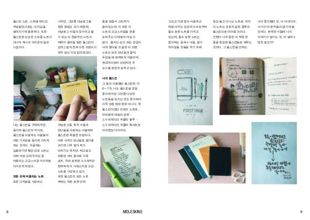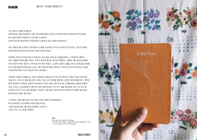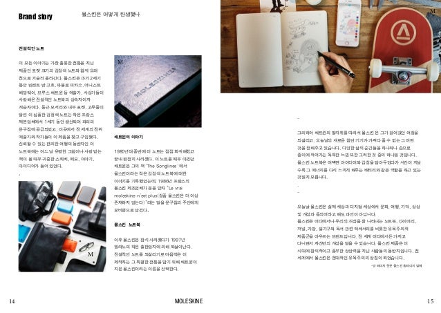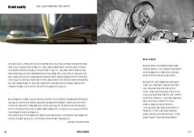 9. 9. 16 17MOLESKINE Brand quality - 이와 같은 최선의 노력에도 불구하고 당사의 통제를 벗어난 요인이 몰스킨 제품의 최종 결과에 영향을 미칠 수 있는 가능성은 언제나 존재합니다. 그렇기 때문에 자동화 생산과 수작업의 조합이 수작업에 의한 생산에서 보편적인 작은 흠이나 차이로 이어질 수 있습니다. 기술 변화나 펄프에 포함되는 화학 성분의 발전이 몰스킨의 종이 제품 컬렉션에 크고 작은 영향을 미칠 수 있는 것입니다. 몰스킨은 그와 같은 사실을 인지하고 당사의 제품 컬렉션에 대해 높은 수준의 일관성과 품질을 유지하기 위해 최선을 다하고 있습니다. 전체 생산 라인에 대한 주기적인 점검을 통해 다수의 매개 변수 전반에 걸쳐 발생하는 원치 않는 변화를 제어합니다. 또한 생산 체인을 따라 각 로트를 추적하여 단계 별로 사용되는 여러 자재를 모니터링할 수 있게 해 주는 고유의 추적 시스템을 갖추고 있습니다. - 몰스킨 제품에서 고객들이 가장 높이 평가하는 세부적인 요소의 대부분은 수작업을 통해 이루어집니다. 모든 몰스킨 노트북의 뒷면 포켓에는 품질 문제가 발생할 경우에 해결할 수 있도록 생산 이력 추적이 가능한 고유 식별 번호가 기재된 품질 관리 스티커가 들어 있습니다. 잘 보관하고 계시다가 몰스킨의 최선의 노력에도 불구하고 당사가 간과했던 결함이 발생할 경우, moleskine.com/quality의 양식을 작성해 제출해 주시면 감사하겠습니다. 어떤 문제든지 알려 주시면 품질에 대한 면밀한 조사를 통해 당사에서 미처 발견하지 못한 결함을 즉시 시정하는 데 도움이 될 것입니다. 고객 여러분의 목소리에 귀를 기울이겠습니다 -전문 몰스킨 홈페이지 발췌 고급 노트의 품질이란 이런 것이다 몰스킨 성공신화 몰스킨은 뛰어난 스토리텔링을 이용해 성공한 브랜드로 유명하다. 이미 사라졌던 브랜드를 좋은 이야기를 활용해 다시 부활시킨다는 것은 말은 쉽지만 잘 짜여진 각본 없이는 불가능하다. 몰스킨을 다시 세운 사람들은 몰스킨을 단순한 수첩이 아닌, 예술가들의 수첩으로 이야기했다. 사실, 새로운 몰스킨은 예전의 몰스킨과는 다르다. 새 몰스킨은 이전과 같은 가죽이 아니라 비닐이 덮인 합성피혁을 이용하며, 완전 수제작이 아니라 일부 수제작이고, 그리고 실제 예술가들이 썼던 노트는 바로 이 브랜드가 아니라 이 브랜드의 모델이 된 다른 문구회사이다. 그러나 몰스킨을 새로 부활시키고자 하면서 이 제조업자는 그 때의 그 몰스킨을 계승한다는 슬로건 아래 모든 이야기를 짜 맞추었고, 그것은 성공해 오늘날의 브랜드 몰스킨을 만들었다. M G