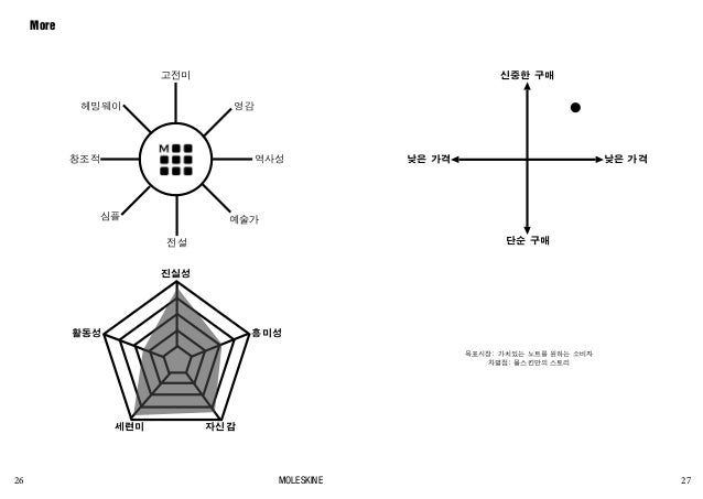 14. 14. 26 27MOLESKINE More 진실성 흥미성활동성 세련미 자신감 고전미 역사성 영감 창조적 전설 예술가 헤밍웨이 심플 신중한 구매 단순 구매 낮은 가격낮은 가격 목표시장: 가치있는 노트를 원하는 소비자 차별점: 몰스킨만의 스토리