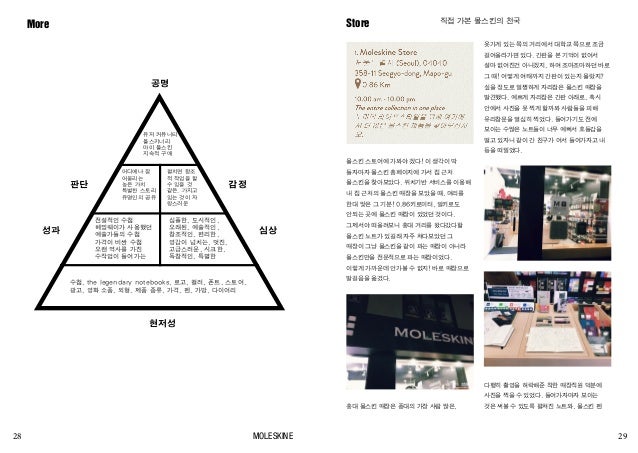 15. 15. 28 29MOLESKINE More 심플한, 도시적인, 오래된, 예술적인, 창조적인, 편리한, 영감이 넘치는, 멋진, 고급스러운, 시크한, 독창적인, 특별한 전설적인 수첩 헤밍웨이가 사용했던 예술가들의 수첩 가격이 비싼 수첩 오랜 역사를 가진 수작업이 들어가는 수첩, the legendary notebooks, 로고, 컬러, 폰트, 스토어, 광고, 영화 소품, 외형, 제품 종류, 가격, 펜, 가방, 다이어리 어디에나 잘 어울리는 높은 가치 특별한 스토리 유명인의 공유 펼치면 창조 적 작업을 할 수 있을 것 같은, 가지고 있는 것이 자 랑스러운 유저 커뮤니티 몰스키너리 마이 몰스킨 지속적 구매 공명 판단 감정 성과 심상 현저성 Store 몰스킨 스토어에 가봐야 겠다! 이 생각이 딱 들자마자 몰스킨 홈페이지에 가서 집 근처 몰스킨을 찾아보았다. 위치기반 서비스를 이용해 내 집 근처의 몰스킨 매장을 보았을 때, 머리를 한대 맞은 그 기분! 0.86키로미터, 일키로도 안되는 곳에 몰스킨 매장이 있었던 것이다. 그제서야 떠올려보니 홍대 거리를 왔다갔다할 몰스킨 노트가 있길래 자주 쳐다보았던 그 매장이 그냥 몰스킨을 같이 파는 매장이 아니라 몰스킨만을 전문적으로 파는 매장이었다. 이렇게 가까운데 안가볼 수 없지! 바로 매장으로 발걸음을 옮겼다. 홍대 몰스킨 매장은 퐁대의 가장 사람 많은, 옷가게 있는 쪽의 거리에서 대학교 쪽으로 조금 걸어올라가면 있다. 간판을 본 기억이 없어서 설마 없어진건 아니겠지, 하며 조마조마하던 바로 그 때! 어떻게 여태까지 간판이 있는지 몰랐지? 싶을 정도로 멀쩡하게 자리잡은 몰스킨 매장을 발견했다. 예쁘게 자리잡은 간판 아래로, 혹시 안에서 사진을 못 찍게 할까봐 사람들을 피해 유리창문을 열심히 찍었다. 들어가기도 전에 보이는 수많은 노트들이 너무 예뻐서 호들갑을 떨고 있자니 같이 간 친구가 어서 들어가자고 내 등을 떠밀었다. 다행히 촬영을 허락해준 착한 매장직원 덕분에 사진을 찍을 수 있었다. 들어가자마자 보이는 것은 써볼 수 있도록 펼쳐진 노트와, 몰스킨 펜 직접 가본 몰스킨의 천국