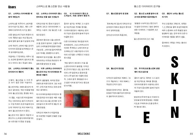 18. 18. 34 35MOLESKINE Users Q1. 스타벅스 다이어리를 왜 받게 되었는지 Q2. 스타벅스 다이어리가 몰스 킨이라는 것을 알고 있었는지 Q3. 이 다이어리가 좋다고 느끼는지, 어떤 면에서 좋은지 Q4. 스타벅스 다이어리가 몰스 킨이라서 더 좋은지 Q5. 이후 스타벅스 다이어리가 몰스킨이 아닌 타 다이어리로 바 뀐다면 어떨지 스타벅스를 자주가서 스티커를 모아서 받기도 했고, 색이 너무 예뻐서 보자마자 사기도 했다 디자인이랑 색/ 폰트가 같았기 때문에 그리고 다이어리에서 느 껴지는 느낌이 그냥 몰스킨 느낌 그렇다. 몰스킨을 그 가격 주 고 쓰기 힘든 것은 사실이다. 솔직히 실망할듯. 하지만 좋은 브랜드로 바뀐다면 또 그냥 쓰겠 지? 근데 서로 버리는 것은 손해 라고 생각한다. 선물 받았는데 구성이 취향이 아 니라 쿠폰만 받고 지인 줬는데, 올해 맘에 들어 출시 당일에 구매 년에 우연히 스벅에 처음 갔다가 다이어리 증정을 알게되었고 금 세 골드멤버십으로.. 처음에는 17잔이라는 터무니 없 는 조건에 참여하지 않으려고 했 으나 마시다 보니 욕심이 생김. 알고있었다 궁금해서 찾아보니 몰스킨이라 고 함.정보가 없어서 그렇구나했 는데 소비자들한테 믿음이 많은 기업인듯. 스벅이랑 함께 제작하 는것 자체도 증명한다고 생각. 유명해서 알고있었음. 몰스킨다 이어리라는 이유로 초반엔 더 후 광효과를 받았던 것 같음. 종이가 얇기는 하지만 그 느낌이 랑 개인적으로 커버를 좋아함. 다이어리를 많이 사용하는 편이 라 구성이 중요한데 올해 구성이 마음에 든다 다른 다이어리랑 차이점은 딱히 모르겠던데..그냥 스타벅스다이 어리라 투자하고 노예가되며 얻 으려하는것! 내용구성이나 다이 어리 내구성은 너무좋다! 이런건 못느꼈음 막상 받아서 쓰다보니 사실 몰 스킨다이어리가 불편함. 디자인 은 군더더기없고 선도 얇고 회색 이라 너무 깔끔하고 좋은데 종 이가 너무 얇아 펜 사용에 한정 적. 그래서 결국 휴대용은 아니 고 얇은 샤프로 일기쓰는 용도로 만 쓰게됨. 몰스킨이라는 브랜드를 알게 되 었고 앞으로도 매년 이용할 예정 이라 몰스킨인것도 좋은듯 하다. 더 좋음. 사실 다른 커피점에서 주는 다이어리는 뭔가 디자인이 나 구성 자체가 조금 마음에 안드 는데 익숙하기도 하고 예쁘기도 해서 몰스킨이라서 더 좋다. 몰스킨이 약간 종이가 두껍게 나 온다거나 스프링다이어리형식으 로 나온다면 더 좋을 것 같음. 타 다이어리업체로 바뀌면 또 찾 아보겠지만 이미 많은 써본 사람 들이 믿고 쓰는 몰스킨이란 인식 인것같아서 왜 바꾸게 됐는지 궁 금할것같음. 디자인이 예쁘거나 마음에 들 면 사겠지만 마음에 안들면 안살 것 같다. Q1. 몰스킨을 알게 된 경로 Q2. 몰스킨 노트를 얼마나 썼 고 어떤 종류를 이용하였는지 Q3. 본인이 느끼는 몰스킨 의 가치 Q4. 몰스킨의 장단점 Q5. 추가적으로 몰스킨에 관련 해서 하고 싶은 말 핫트랙스에 갔는데 디자인이 단 순하면서 예쁘고 질감이 좋아보 여서 알게되었음. 달별로 나눠져 있는 중간크기 의 얇은 다이어리 / 일반 손바닥 만한 다이어리 / 사용한지 4년 되었음. 우선 고등학교 3학년과, 대학교 1,2,3학년을 함께 보냈기때문에 매우 소중하며 아주 특별한 일이 발생하지 않는 경우 딱히 다른 다 이어리를 이용할 생각이 없음. 디자인이 깔끔하고 예쁘다 / 크 기가 적당하다 / 색이 예쁘다 / 적당한 간지가 있다 종이가 얇기는 하지만 그 느낌이 랑 개인적으로 커버를 좋아함. 다이어리를 많이 사용하는 편이 라 구성이 중요한데 올해 구성이 마음에 든다 인터넷 다이어리 폭풍서치. 몰스킨다이어리 2년 사용 종이에의 기록을 기계는 흉내내 지 못한다. 장점은 전체 디자인. 종이질. 단점은 지면내용구성의 편리성 이 합리적이지 못하다. 명성에 안주하지 말고 시대의 다 양성을 반영해 끊임없는 새로운 시도로 구매자의니즈를 만족시 켜 줬으면 한다. M 0 L E S K I N 스타벅스로 몰스킨을 만난 사람들 몰스킨 다이어리의 친구들