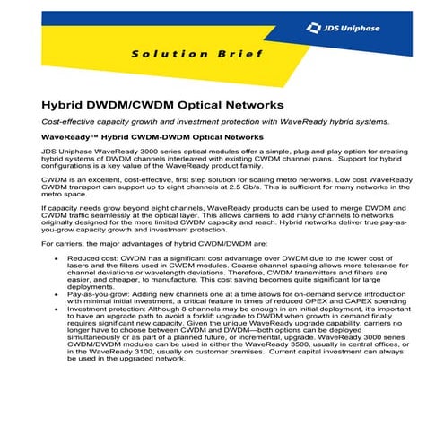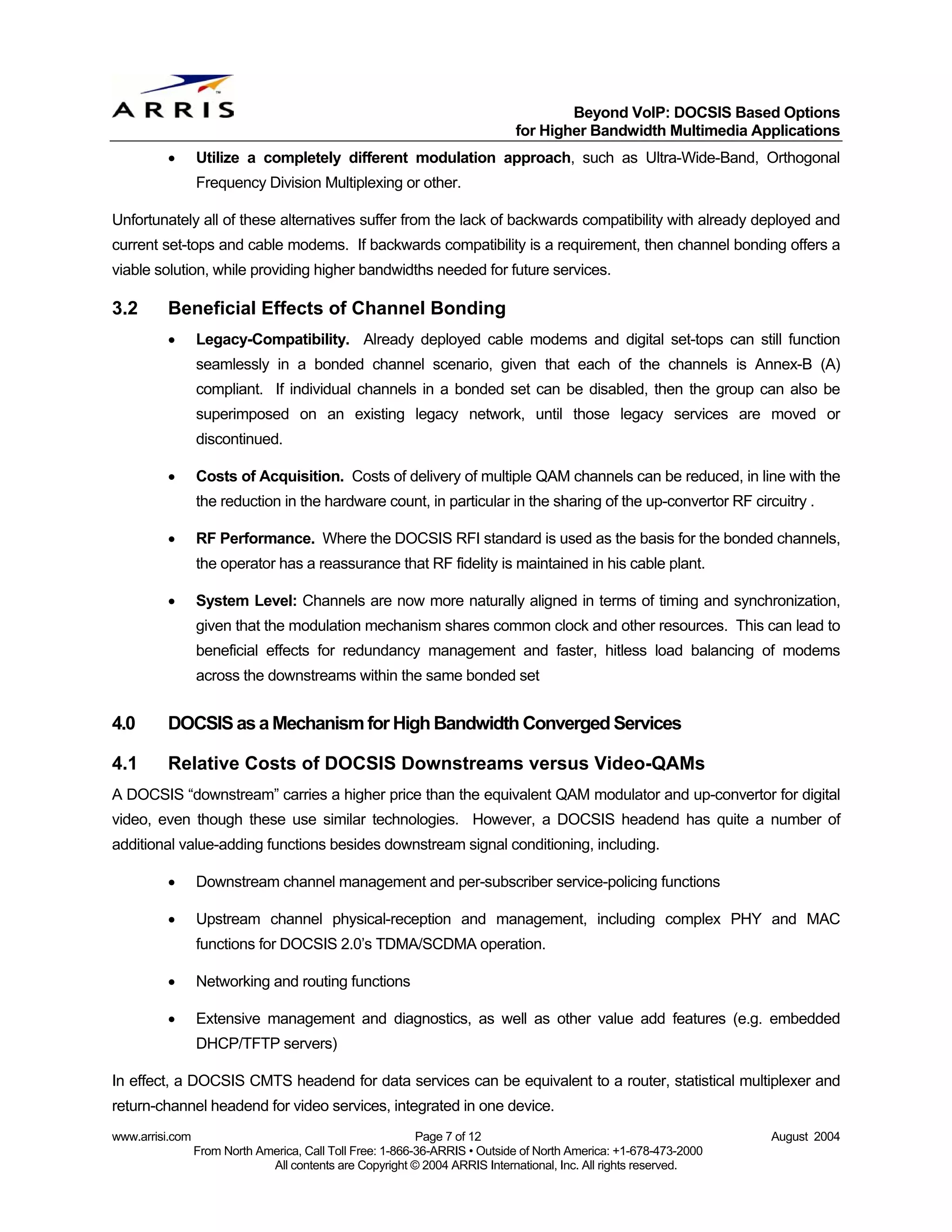 7. 7. Beyond VoIP: DOCSIS Based Options for Higher Bandwidth Multimedia Applications • Utilize a completely different modulation approach, such as Ultra-Wide-Band, Orthogonal Frequency Division Multiplexing or other. Unfortunately all of these alternatives suffer from the lack of backwards compatibility with already deployed and current set-tops and cable modems. If backwards compatibility is a requirement, then channel bonding offers a viable solution, while providing higher bandwidths needed for future services. 3.2 Beneficial Effects of Channel Bonding • Legacy-Compatibility. Already deployed cable modems and digital set-tops can still function seamlessly in a bonded channel scenario, given that each of the channels is Annex-B (A) compliant. If individual channels in a bonded set can be disabled, then the group can also be superimposed on an existing legacy network, until those legacy services are moved or discontinued. • Costs of Acquisition. Costs of delivery of multiple QAM channels can be reduced, in line with the the reduction in the hardware count, in particular in the sharing of the up-convertor RF circuitry . • RF Performance. Where the DOCSIS RFI standard is used as the basis for the bonded channels, the operator has a reassurance that RF fidelity is maintained in his cable plant. • System Level: Channels are now more naturally aligned in terms of timing and synchronization, given that the modulation mechanism shares common clock and other resources. This can lead to beneficial effects for redundancy management and faster, hitless load balancing of modems across the downstreams within the same bonded set 4.0 DOCSIS as a Mechanism for High Bandwidth Converged Services 4.1 Relative Costs of DOCSIS Downstreams versus Video-QAMs A DOCSIS “downstream” carries a higher price than the equivalent QAM modulator and up-convertor for digital video, even though these use similar technologies. However, a DOCSIS headend has quite a number of additional value-adding functions besides downstream signal conditioning, including. • Downstream channel management and per-subscriber service-policing functions • Upstream channel physical-reception and management, including complex PHY and MAC functions for DOCSIS 2.0’s TDMA/SCDMA operation. • Networking and routing functions • Extensive management and diagnostics, as well as other value add features (e.g. embedded DHCP/TFTP servers) In effect, a DOCSIS CMTS headend for data services can be equivalent to a router, statistical multiplexer and return-channel headend for video services, integrated in one device. www.arrisi.com Page 7 of 12 August 2004 From North America, Call Toll Free: 1-866-36-ARRIS • Outside of North America: +1-678-473-2000 All contents are Copyright © 2004 ARRIS International, Inc. All rights reserved.