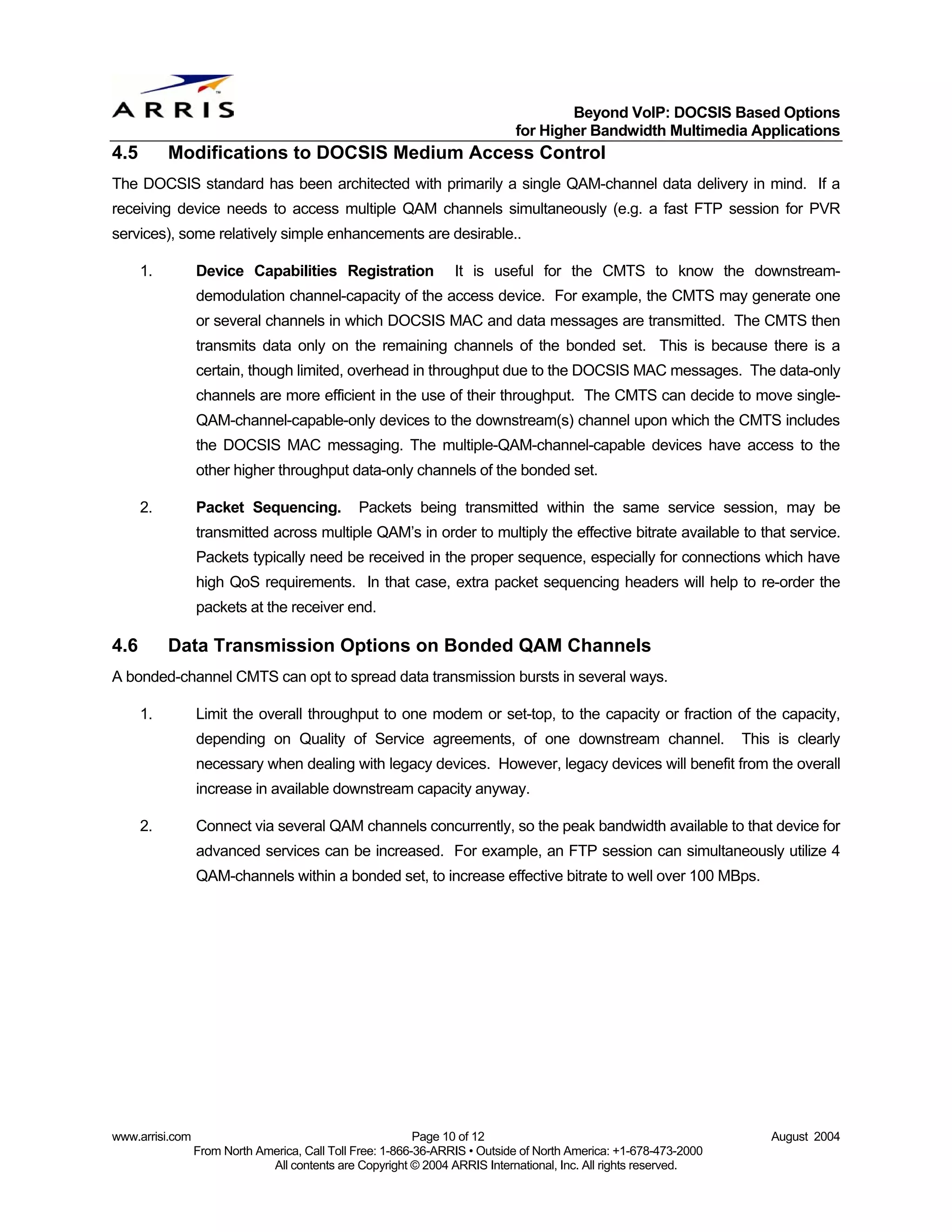 10. 10. Beyond VoIP: DOCSIS Based Options for Higher Bandwidth Multimedia Applications 4.5 Modifications to DOCSIS Medium Access Control The DOCSIS standard has been architected with primarily a single QAM-channel data delivery in mind. If a receiving device needs to access multiple QAM channels simultaneously (e.g. a fast FTP session for PVR services), some relatively simple enhancements are desirable.. 1. Device Capabilities Registration It is useful for the CMTS to know the downstream- demodulation channel-capacity of the access device. For example, the CMTS may generate one or several channels in which DOCSIS MAC and data messages are transmitted. The CMTS then transmits data only on the remaining channels of the bonded set. This is because there is a certain, though limited, overhead in throughput due to the DOCSIS MAC messages. The data-only channels are more efficient in the use of their throughput. The CMTS can decide to move single- QAM-channel-capable-only devices to the downstream(s) channel upon which the CMTS includes the DOCSIS MAC messaging. The multiple-QAM-channel-capable devices have access to the other higher throughput data-only channels of the bonded set. 2. Packet Sequencing. Packets being transmitted within the same service session, may be transmitted across multiple QAM’s in order to multiply the effective bitrate available to that service. Packets typically need be received in the proper sequence, especially for connections which have high QoS requirements. In that case, extra packet sequencing headers will help to re-order the packets at the receiver end. 4.6 Data Transmission Options on Bonded QAM Channels A bonded-channel CMTS can opt to spread data transmission bursts in several ways. 1. Limit the overall throughput to one modem or set-top, to the capacity or fraction of the capacity, depending on Quality of Service agreements, of one downstream channel. This is clearly necessary when dealing with legacy devices. However, legacy devices will benefit from the overall increase in available downstream capacity anyway. 2. Connect via several QAM channels concurrently, so the peak bandwidth available to that device for advanced services can be increased. For example, an FTP session can simultaneously utilize 4 QAM-channels within a bonded set, to increase effective bitrate to well over 100 MBps. www.arrisi.com Page 10 of 12 August 2004 From North America, Call Toll Free: 1-866-36-ARRIS • Outside of North America: +1-678-473-2000 All contents are Copyright © 2004 ARRIS International, Inc. All rights reserved.