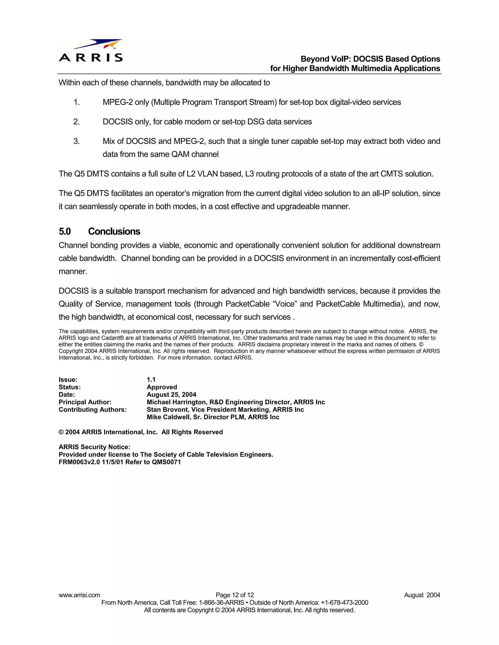 12. 12. Beyond VoIP: DOCSIS Based Options for Higher Bandwidth Multimedia Applications Within each of these channels, bandwidth may be allocated to 1. MPEG-2 only (Multiple Program Transport Stream) for set-top box digital-video services 2. DOCSIS only, for cable modem or set-top DSG data services 3. Mix of DOCSIS and MPEG-2, such that a single tuner capable set-top may extract both video and data from the same QAM channel The Q5 DMTS contains a full suite of L2 VLAN based, L3 routing protocols of a state of the art CMTS solution. The Q5 DMTS facilitates an operator’s migration from the current digital video solution to an all-IP solution, since it can seamlessly operate in both modes, in a cost effective and upgradeable manner. 5.0 Conclusions Channel bonding provides a viable, economic and operationally convenient solution for additional downstream cable bandwidth. Channel bonding can be provided in a DOCSIS environment in an incrementally cost-efficient manner. DOCSIS is a suitable transport mechanism for advanced and high bandwidth services, because it provides the Quality of Service, management tools (through PacketCable “Voice” and PacketCable Multimedia), and now, the high bandwidth, at economical cost, necessary for such services . The capabilities, system requirements and/or compatibility with third-party products described herein are subject to change without notice. ARRIS, the ARRIS logo and Cadant® are all trademarks of ARRIS International, Inc. Other trademarks and trade names may be used in this document to refer to either the entities claiming the marks and the names of their products. ARRIS disclaims proprietary interest in the marks and names of others. © Copyright 2004 ARRIS International, Inc. All rights reserved. Reproduction in any manner whatsoever without the express written permission of ARRIS International, Inc., is strictly forbidden. For more information, contact ARRIS. Issue: 1.1 Status: Approved Date: August 25, 2004 Principal Author: Michael Harrington, R&D Engineering Director, ARRIS Inc Contributing Authors: Stan Brovont, Vice President Marketing, ARRIS Inc Mike Caldwell, Sr. Director PLM, ARRIS Inc © 2004 ARRIS International, Inc. All Rights Reserved ARRIS Security Notice: Provided under license to The Society of Cable Television Engineers. FRM0063v2.0 11/5/01 Refer to QMS0071 www.arrisi.com Page 12 of 12 August 2004 From North America, Call Toll Free: 1-866-36-ARRIS • Outside of North America: +1-678-473-2000 All contents are Copyright © 2004 ARRIS International, Inc. All rights reserved.