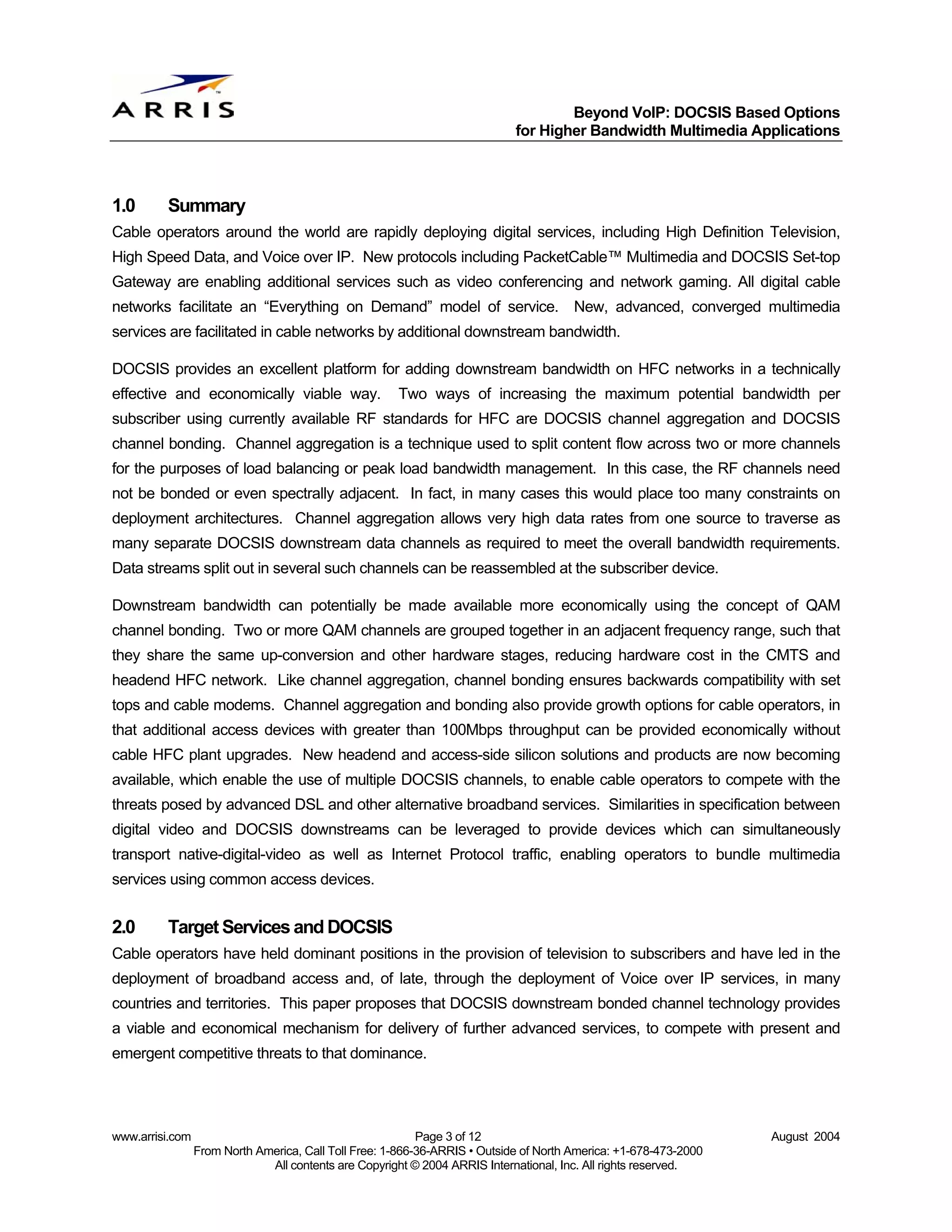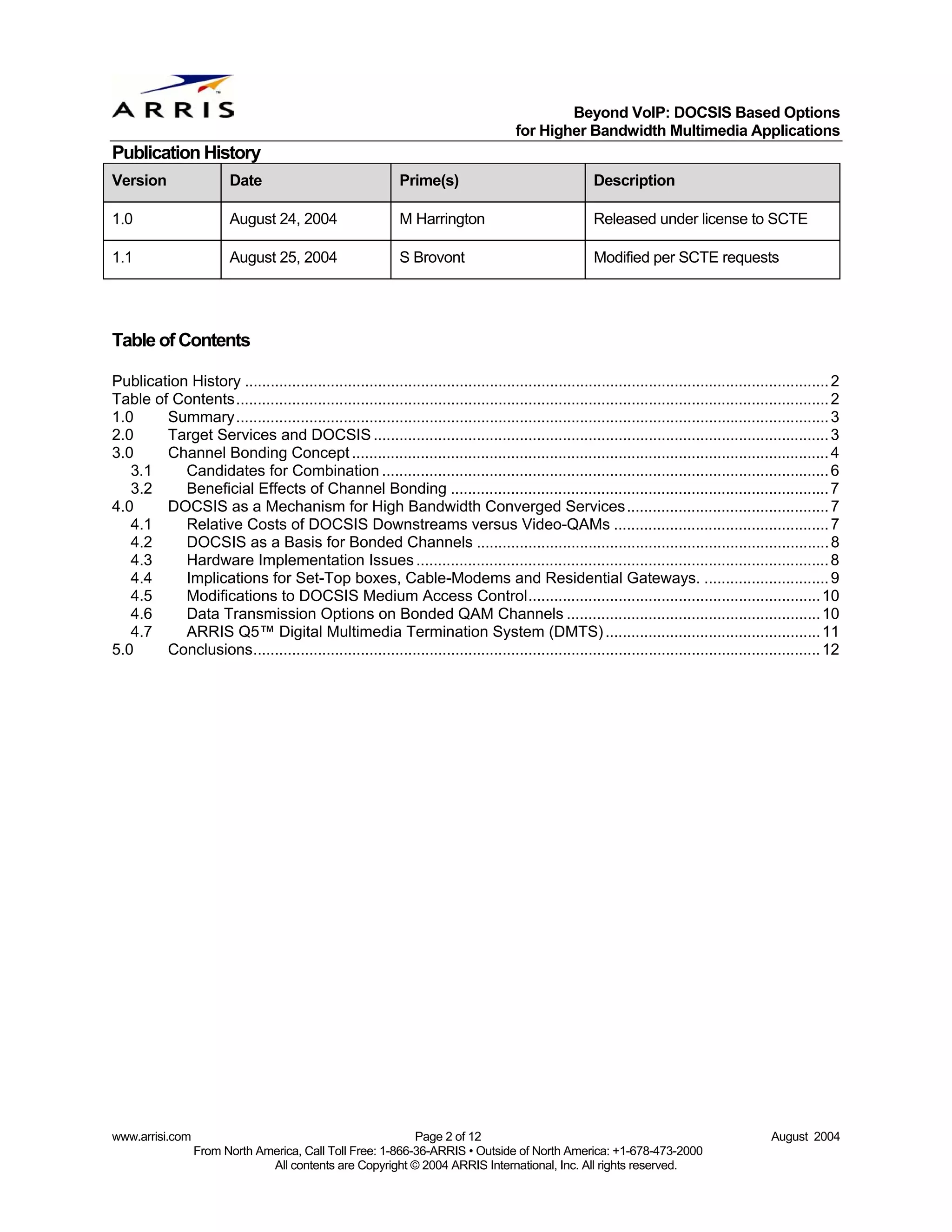 2. 2. Beyond VoIP: DOCSIS Based Options for Higher Bandwidth Multimedia Applications Publication History Version Date Prime(s) Description 1.0 August 24, 2004 M Harrington Released under license to SCTE 1.1 August 25, 2004 S Brovont Modified per SCTE requests Table of Contents Publication History ........................................................................................................................................ 2 Table of Contents.......................................................................................................................................... 2 1.0 Summary.......................................................................................................................................... 3 2.0 Target Services and DOCSIS .......................................................................................................... 3 3.0 Channel Bonding Concept ............................................................................................................... 4 3.1 Candidates for Combination ........................................................................................................ 6 3.2 Beneficial Effects of Channel Bonding ........................................................................................ 7 4.0 DOCSIS as a Mechanism for High Bandwidth Converged Services............................................... 7 4.1 Relative Costs of DOCSIS Downstreams versus Video-QAMs .................................................. 7 4.2 DOCSIS as a Basis for Bonded Channels .................................................................................. 8 4.3 Hardware Implementation Issues ................................................................................................ 8 4.4 Implications for Set-Top boxes, Cable-Modems and Residential Gateways. ............................. 9 4.5 Modifications to DOCSIS Medium Access Control.................................................................... 10 4.6 Data Transmission Options on Bonded QAM Channels ........................................................... 10 4.7 ARRIS Q5™ Digital Multimedia Termination System (DMTS) .................................................. 11 5.0 Conclusions.................................................................................................................................... 12 www.arrisi.com Page 2 of 12 August 2004 From North America, Call Toll Free: 1-866-36-ARRIS • Outside of North America: +1-678-473-2000 All contents are Copyright © 2004 ARRIS International, Inc. All rights reserved.
