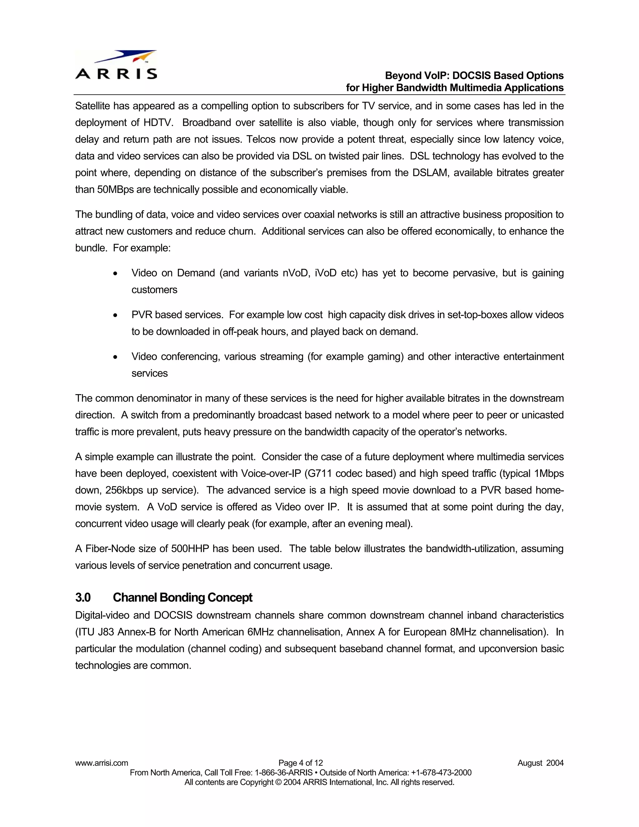 4. 4. Beyond VoIP: DOCSIS Based Options for Higher Bandwidth Multimedia Applications Satellite has appeared as a compelling option to subscribers for TV service, and in some cases has led in the deployment of HDTV. Broadband over satellite is also viable, though only for services where transmission delay and return path are not issues. Telcos now provide a potent threat, especially since low latency voice, data and video services can also be provided via DSL on twisted pair lines. DSL technology has evolved to the point where, depending on distance of the subscriber’s premises from the DSLAM, available bitrates greater than 50MBps are technically possible and economically viable. The bundling of data, voice and video services over coaxial networks is still an attractive business proposition to attract new customers and reduce churn. Additional services can also be offered economically, to enhance the bundle. For example: • Video on Demand (and variants nVoD, iVoD etc) has yet to become pervasive, but is gaining customers • PVR based services. For example low cost high capacity disk drives in set-top-boxes allow videos to be downloaded in off-peak hours, and played back on demand. • Video conferencing, various streaming (for example gaming) and other interactive entertainment services The common denominator in many of these services is the need for higher available bitrates in the downstream direction. A switch from a predominantly broadcast based network to a model where peer to peer or unicasted traffic is more prevalent, puts heavy pressure on the bandwidth capacity of the operator’s networks. A simple example can illustrate the point. Consider the case of a future deployment where multimedia services have been deployed, coexistent with Voice-over-IP (G711 codec based) and high speed traffic (typical 1Mbps down, 256kbps up service). The advanced service is a high speed movie download to a PVR based home- movie system. A VoD service is offered as Video over IP. It is assumed that at some point during the day, concurrent video usage will clearly peak (for example, after an evening meal). A Fiber-Node size of 500HHP has been used. The table below illustrates the bandwidth-utilization, assuming various levels of service penetration and concurrent usage. 3.0 Channel Bonding Concept Digital-video and DOCSIS downstream channels share common downstream channel inband characteristics (ITU J83 Annex-B for North American 6MHz channelisation, Annex A for European 8MHz channelisation). In particular the modulation (channel coding) and subsequent baseband channel format, and upconversion basic technologies are common. www.arrisi.com Page 4 of 12 August 2004 From North America, Call Toll Free: 1-866-36-ARRIS • Outside of North America: +1-678-473-2000 All contents are Copyright © 2004 ARRIS International, Inc. All rights reserved.
