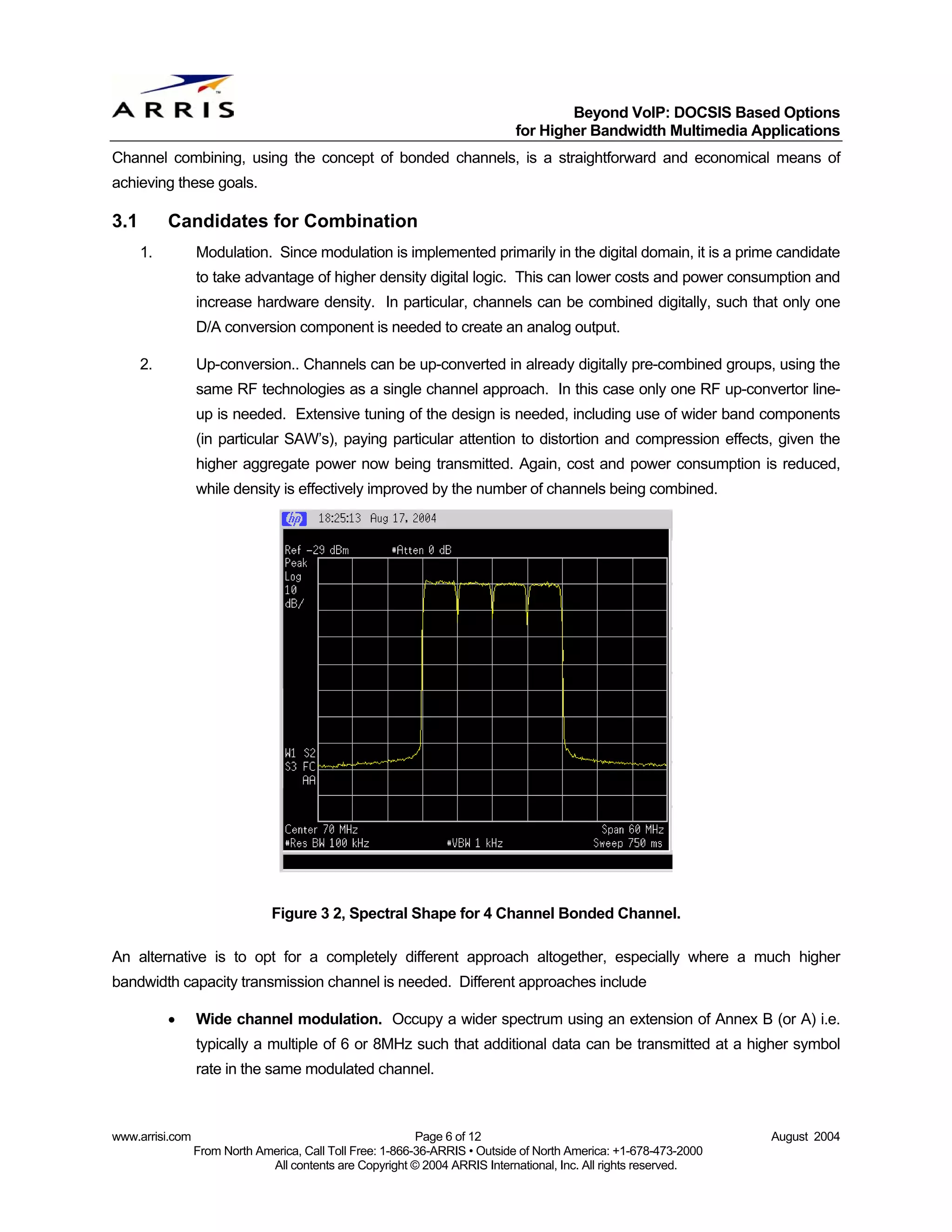 6. 6. Beyond VoIP: DOCSIS Based Options for Higher Bandwidth Multimedia Applications Channel combining, using the concept of bonded channels, is a straightforward and economical means of achieving these goals. 3.1 Candidates for Combination 1. Modulation. Since modulation is implemented primarily in the digital domain, it is a prime candidate to take advantage of higher density digital logic. This can lower costs and power consumption and increase hardware density. In particular, channels can be combined digitally, such that only one D/A conversion component is needed to create an analog output. 2. Up-conversion.. Channels can be up-converted in already digitally pre-combined groups, using the same RF technologies as a single channel approach. In this case only one RF up-convertor line- up is needed. Extensive tuning of the design is needed, including use of wider band components (in particular SAW’s), paying particular attention to distortion and compression effects, given the higher aggregate power now being transmitted. Again, cost and power consumption is reduced, while density is effectively improved by the number of channels being combined. Figure 3 2, Spectral Shape for 4 Channel Bonded Channel. An alternative is to opt for a completely different approach altogether, especially where a much higher bandwidth capacity transmission channel is needed. Different approaches include • Wide channel modulation. Occupy a wider spectrum using an extension of Annex B (or A) i.e. typically a multiple of 6 or 8MHz such that additional data can be transmitted at a higher symbol rate in the same modulated channel. www.arrisi.com Page 6 of 12 August 2004 From North America, Call Toll Free: 1-866-36-ARRIS • Outside of North America: +1-678-473-2000 All contents are Copyright © 2004 ARRIS International, Inc. All rights reserved.