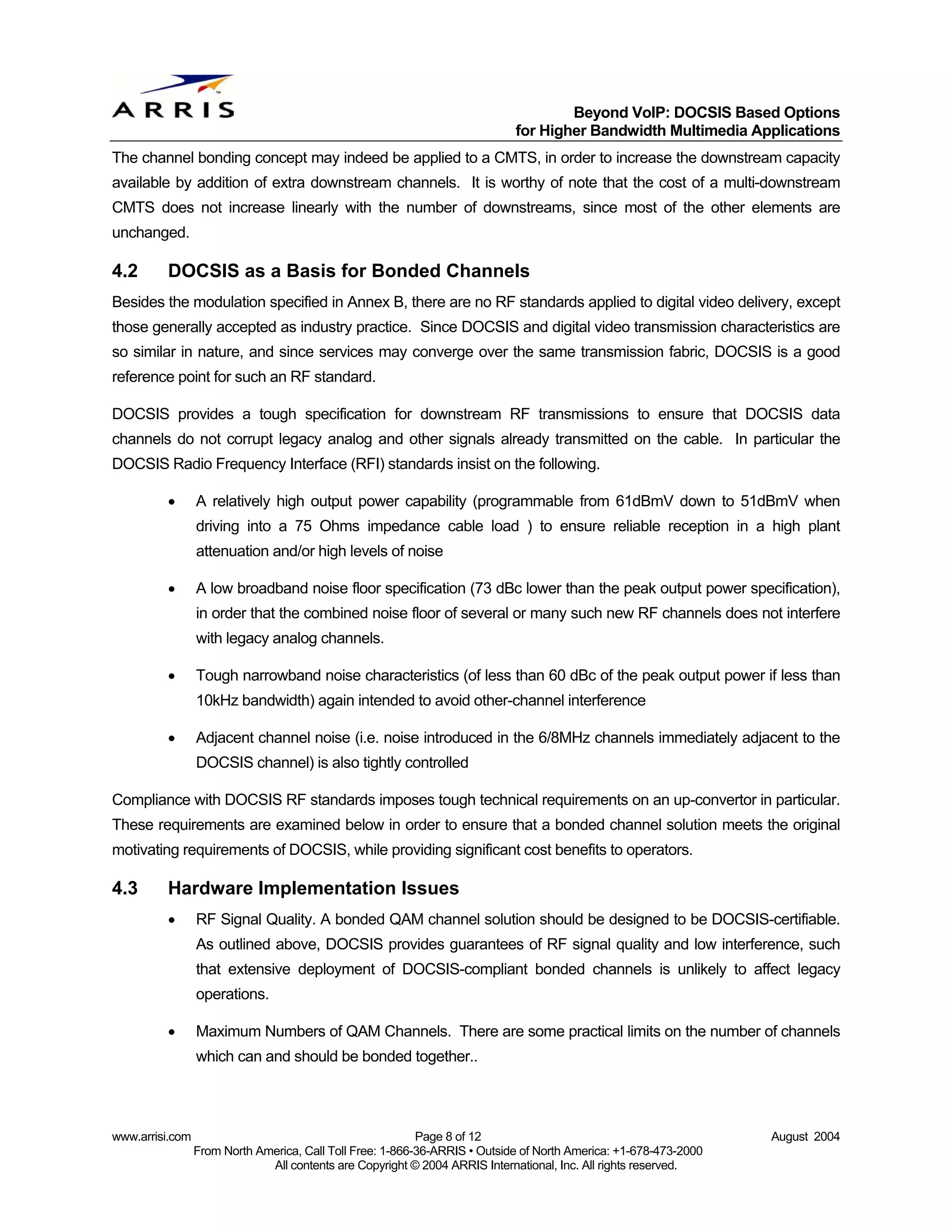8. 8. Beyond VoIP: DOCSIS Based Options for Higher Bandwidth Multimedia Applications The channel bonding concept may indeed be applied to a CMTS, in order to increase the downstream capacity available by addition of extra downstream channels. It is worthy of note that the cost of a multi-downstream CMTS does not increase linearly with the number of downstreams, since most of the other elements are unchanged. 4.2 DOCSIS as a Basis for Bonded Channels Besides the modulation specified in Annex B, there are no RF standards applied to digital video delivery, except those generally accepted as industry practice. Since DOCSIS and digital video transmission characteristics are so similar in nature, and since services may converge over the same transmission fabric, DOCSIS is a good reference point for such an RF standard. DOCSIS provides a tough specification for downstream RF transmissions to ensure that DOCSIS data channels do not corrupt legacy analog and other signals already transmitted on the cable. In particular the DOCSIS Radio Frequency Interface (RFI) standards insist on the following. • A relatively high output power capability (programmable from 61dBmV down to 51dBmV when driving into a 75 Ohms impedance cable load ) to ensure reliable reception in a high plant attenuation and/or high levels of noise • A low broadband noise floor specification (73 dBc lower than the peak output power specification), in order that the combined noise floor of several or many such new RF channels does not interfere with legacy analog channels. • Tough narrowband noise characteristics (of less than 60 dBc of the peak output power if less than 10kHz bandwidth) again intended to avoid other-channel interference • Adjacent channel noise (i.e. noise introduced in the 6/8MHz channels immediately adjacent to the DOCSIS channel) is also tightly controlled Compliance with DOCSIS RF standards imposes tough technical requirements on an up-convertor in particular. These requirements are examined below in order to ensure that a bonded channel solution meets the original motivating requirements of DOCSIS, while providing significant cost benefits to operators. 4.3 Hardware Implementation Issues • RF Signal Quality. A bonded QAM channel solution should be designed to be DOCSIS-certifiable. As outlined above, DOCSIS provides guarantees of RF signal quality and low interference, such that extensive deployment of DOCSIS-compliant bonded channels is unlikely to affect legacy operations. • Maximum Numbers of QAM Channels. There are some practical limits on the number of channels which can and should be bonded together.. www.arrisi.com Page 8 of 12 August 2004 From North America, Call Toll Free: 1-866-36-ARRIS • Outside of North America: +1-678-473-2000 All contents are Copyright © 2004 ARRIS International, Inc. All rights reserved.