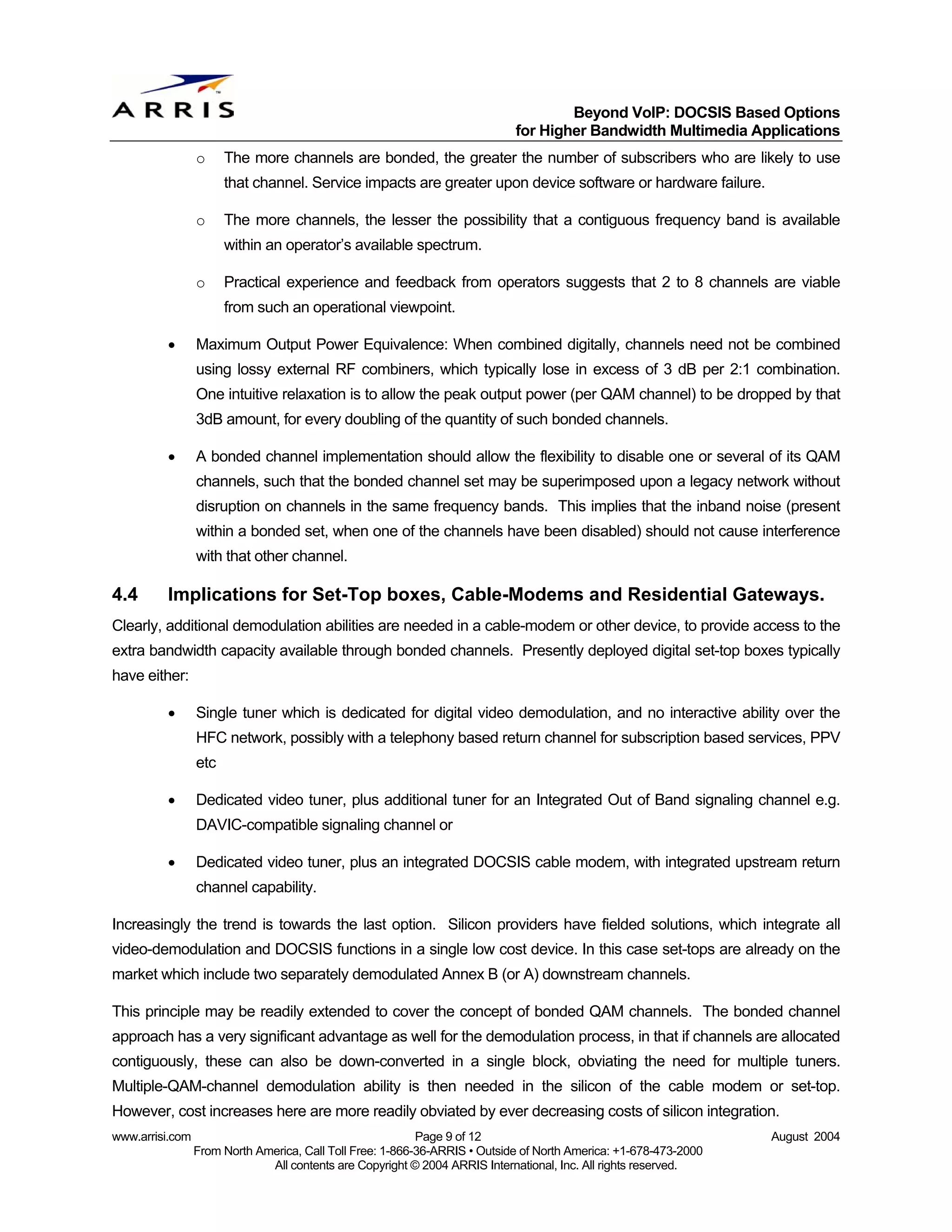 9. 9. Beyond VoIP: DOCSIS Based Options for Higher Bandwidth Multimedia Applications o The more channels are bonded, the greater the number of subscribers who are likely to use that channel. Service impacts are greater upon device software or hardware failure. o The more channels, the lesser the possibility that a contiguous frequency band is available within an operator’s available spectrum. o Practical experience and feedback from operators suggests that 2 to 8 channels are viable from such an operational viewpoint. • Maximum Output Power Equivalence: When combined digitally, channels need not be combined using lossy external RF combiners, which typically lose in excess of 3 dB per 2:1 combination. One intuitive relaxation is to allow the peak output power (per QAM channel) to be dropped by that 3dB amount, for every doubling of the quantity of such bonded channels. • A bonded channel implementation should allow the flexibility to disable one or several of its QAM channels, such that the bonded channel set may be superimposed upon a legacy network without disruption on channels in the same frequency bands. This implies that the inband noise (present within a bonded set, when one of the channels have been disabled) should not cause interference with that other channel. 4.4 Implications for Set-Top boxes, Cable-Modems and Residential Gateways. Clearly, additional demodulation abilities are needed in a cable-modem or other device, to provide access to the extra bandwidth capacity available through bonded channels. Presently deployed digital set-top boxes typically have either: • Single tuner which is dedicated for digital video demodulation, and no interactive ability over the HFC network, possibly with a telephony based return channel for subscription based services, PPV etc • Dedicated video tuner, plus additional tuner for an Integrated Out of Band signaling channel e.g. DAVIC-compatible signaling channel or • Dedicated video tuner, plus an integrated DOCSIS cable modem, with integrated upstream return channel capability. Increasingly the trend is towards the last option. Silicon providers have fielded solutions, which integrate all video-demodulation and DOCSIS functions in a single low cost device. In this case set-tops are already on the market which include two separately demodulated Annex B (or A) downstream channels. This principle may be readily extended to cover the concept of bonded QAM channels. The bonded channel approach has a very significant advantage as well for the demodulation process, in that if channels are allocated contiguously, these can also be down-converted in a single block, obviating the need for multiple tuners. Multiple-QAM-channel demodulation ability is then needed in the silicon of the cable modem or set-top. However, cost increases here are more readily obviated by ever decreasing costs of silicon integration. www.arrisi.com Page 9 of 12 August 2004 From North America, Call Toll Free: 1-866-36-ARRIS • Outside of North America: +1-678-473-2000 All contents are Copyright © 2004 ARRIS International, Inc. All rights reserved.