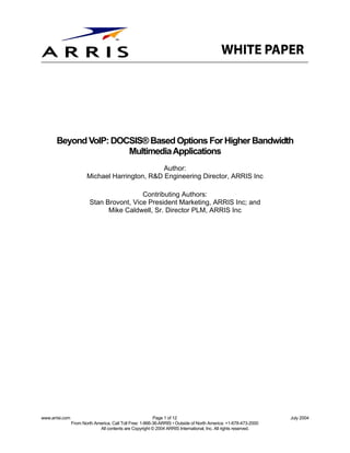 1. 1. Beyond VoIP: DOCSIS® Based Options For Higher Bandwidth Multimedia Applications Author: Michael Harrington, R&D Engineering Director, ARRIS Inc Contributing Authors: Stan Brovont, Vice President Marketing, ARRIS Inc; and Mike Caldwell, Sr. Director PLM, ARRIS Inc www.arrisi.com Page 1 of 12 July 2004 From North America, Call Toll Free: 1-866-36-ARRIS • Outside of North America: +1-678-473-2000 All contents are Copyright © 2004 ARRIS International, Inc. All rights reserved.