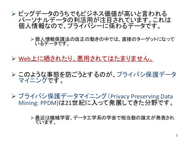 プライバシ保護データマイニング(Privacy Preserving Data Mining: PPDM)は21世紀に入って発展してきた分野です。