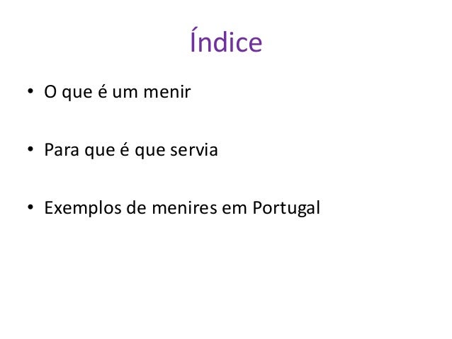 1. 1. Índice • O que é um menir • Para que é que servia • Exemplos de menires em Portugal