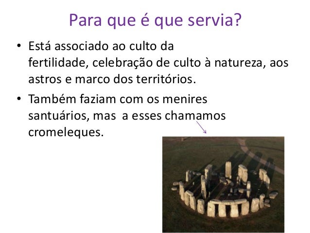 3. 3. Para que é que servia? • Está associado ao culto da fertilidade, celebração de culto à natureza, aos astros e marco dos territórios. • Também faziam com os menires santuários, mas a esses chamamos cromeleques.