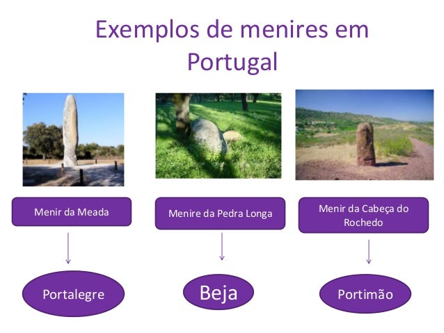 4. 4. Exemplos de menires em Portugal Menir da Meada Menire da Pedra Longa Menir da Cabeça do Rochedo Portalegre Beja Portimão