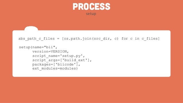 11. 11. Process setup abs_path_c_files = [os.path.join(src_dir, c) for c in c_files] setup(name="bii", version=VERSION, script_name='setup.py', script_args=['build_ext'], packages=['biicode'], ext_modules=modules)