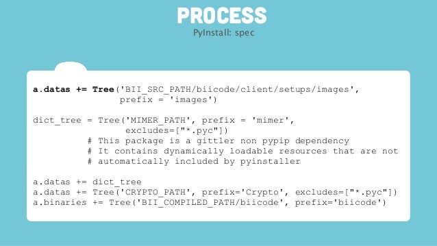 13. 13. Process PyInstall: spec a.datas += Tree('BII_SRC_PATH/biicode/client/setups/images', prefix = 'images') dict_tree = Tree('MIMER_PATH', prefix = 'mimer', excludes=["*.pyc"]) # This package is a gittler non pypip dependency # It contains dynamically loadable resources that are not # automatically included by pyinstaller a.datas += dict_tree a.datas += Tree('CRYPTO_PATH', prefix='Crypto', excludes=["*.pyc"]) a.binaries += Tree('BII_COMPILED_PATH/biicode', prefix='biicode')