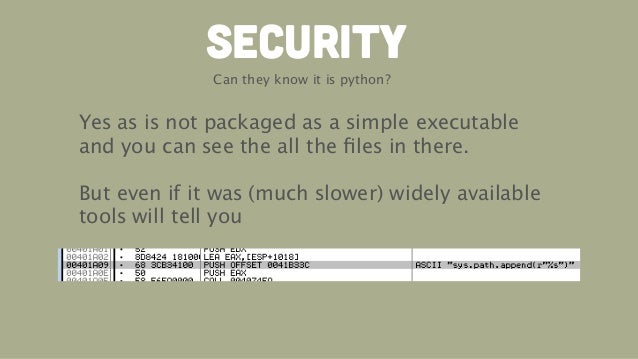 14. 14. Security Can they know it is python? Yes as is not packaged as a simple executable and you can see the all the files in there. ! But even if it was (much slower) widely available tools will tell you