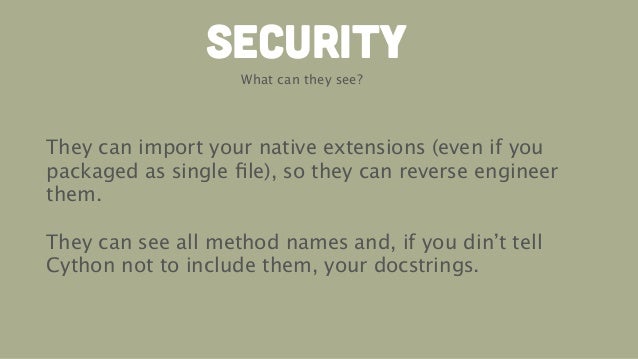 15. 15. Security What can they see? They can import your native extensions (even if you packaged as single file), so they can reverse engineer them. ! They can see all method names and, if you din’t tell Cython not to include them, your docstrings.