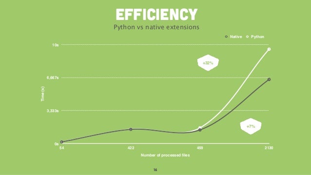 16. 16. Time(s) 0s 3,333s 6,667s 10s Number of processed files 54 422 459 2130 Native Python Efficiency Python vs native extensions +32% 16 +7%
