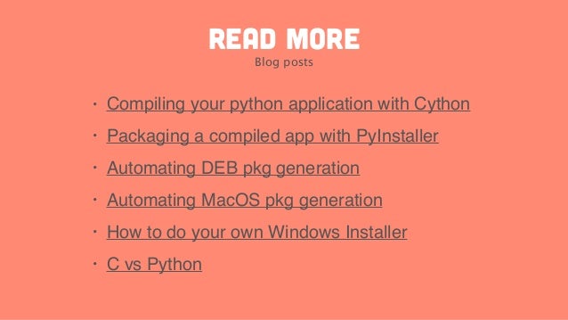 17. 17. Read More • Compiling your python application with Cython! • Packaging a compiled app with PyInstaller! • Automating DEB pkg generation! • Automating MacOS pkg generation! • How to do your own Windows Installer! • C vs Python Blog posts
